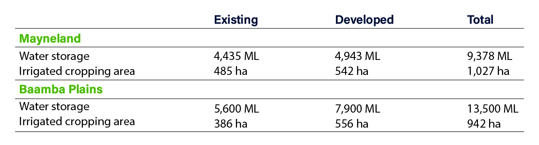 RFM invested significantly in both properties post-acquisition to boost productivity via additional irrigated cropping capacity. At Baamba Plains (acquired November 2021), developments expanded irrigation from two to five large-scale lateral irrigators covering over 900 ha, with new water storages built by moving 2.8 million cubic metres of soil into eight-metre-high walls for enhanced security and reduced evaporation. At Mayneland (acquired 2018), an additional 4,940 ML water storage was constructed, three centre pivot irrigators were upgraded with an additional seven installed, increasing the irrigated area from 485 ha to approximately 1,000 ha.