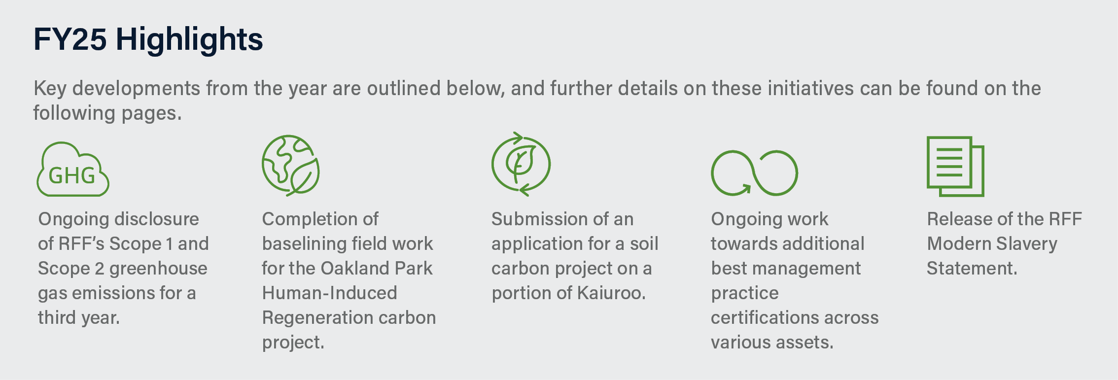 During FY25, RFM continued to progress various RFF sustainability initiatives, which are detailed in the RFF Annual Report including: